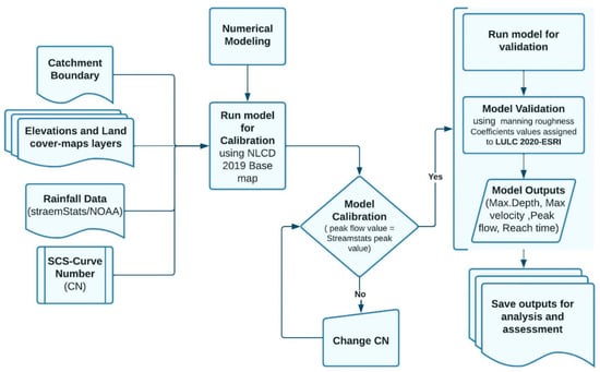 To calibrate and verify the methodology of generating the proposed Manning’s roughness values, nine catchment areas were randomly selected based on the data available on StreamStats. A spatial Manning’s roughness layer for each catchment was generated based on the proposed values from the assessment step using HEC-RAS 2D (v. 6.2) [,]. A Digital Elevation Model (DEM) was downloaded for each catchment area location with the best available resolution from U.S. national map imagery []. The nine rain-on-grid simulation models have been calibrated by implementing the NLCD 2019 map as a first step, using the reference Manning’s roughness values provided in the HEC-RAS Mapper manual []. Rainfall data and peak flow values were obtained from StreamStats. The NOAA Atlas 14 database was used to obtain the missing rainfall data that have no values in StreamStats. Then model scenario runs were performed using the LULC 2020-ESRI with the proposed Manning’s roughness values to be compared with the model scenario runs using the NLCD 2019. A flow chart in Figure 4 describes this part of the conducted methodology.
