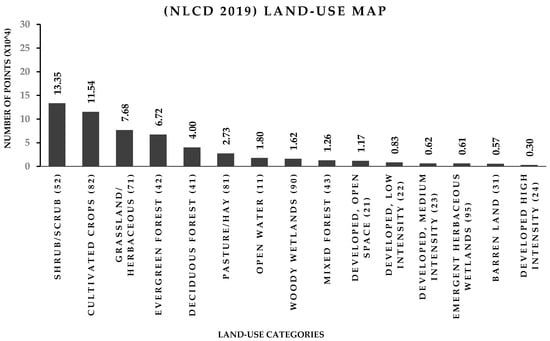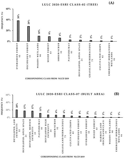 To quantify the cross-correspondence between both maps, a detailed analysis was conducted for each class separately after excluding the snow and cloud classes. LULC 2020-ESRI land-use map data were assessed using a confusion matrix using NLCD 2019 land-use map data as well-trusted and high-accuracy data [,]. Table 4 shows the accuracy assessment results.