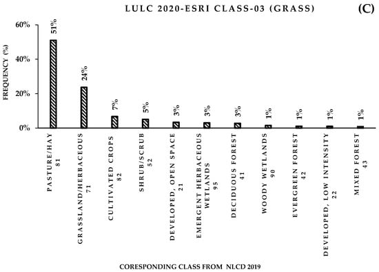 Frequency analysis for the biased classes from the LULC 2020-ESRI map. (A) Tree, (B) Built area, (C) Grass.