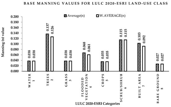 As a result, from this analysis, the suggested Manning’s roughness values for each LULC 2020-ESRI class using the two previous methods are presented in Table 5. Comparison between the developed Manning’s roughness values for the two methods, average and weighted average, is illustrated in Figure 8.