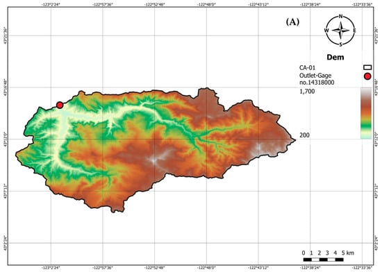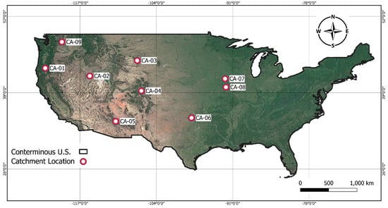 Rain-On-Grid (ROG) simulations for the modeling of 2D unsteady flows and floodplain parameters in response to precipitation input were implemented in HEC-RAS V.6.2 software to validate the performance of the presented methodology [,]. Nine catchments were randomly selected based on the data availability in StreamStats and NOAA Atlas 14. Figure 9 shows the location of the selected catchments in the conterminous United States. Rainfall and runoff flow data were extracted from StreamStats and NOAA Atlas 14, respectively. The selected catchments have varied areas (from 8 km2 to 460 km2) with a mixed land-use cover. Table 6 shows the selected catchment locations and areas. Figure A1, Figure A2, Figure A3, Figure A4, Figure A5, Figure A6, Figure A7, Figure A8 and Figure A9 in Appendix A show the DEM and land-use land-cover maps with the spatial distribution for these catchments. Figure 10 shows DEM and land-use maps for each class for catchment CA-01 as an example.
