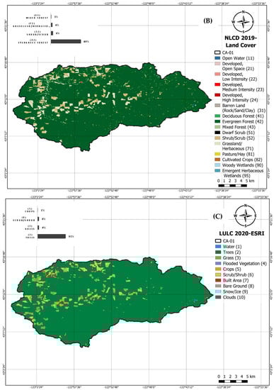 DEM and land-use maps for Catchment CA-09 (A) DEM, (B) NLCD 2019 land-use map, (C) LULC 2020-ESRI land-use map.