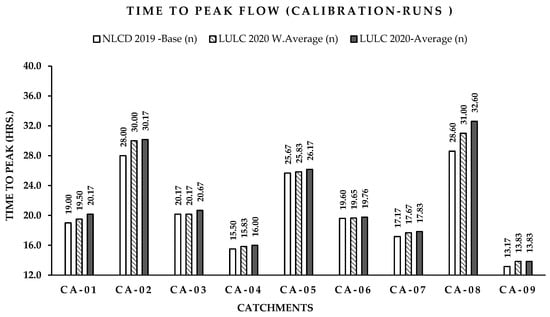Model calibration and validation based on water level and flow observations are necessary to determine any model’s ability to reproduce reality []. The HEC-RAS (v.6.2) model was calibrated using the calibration data in Table 7 and as mentioned in the methodology section. The main objective of this step was to assess the effect of implementing the developed Manning’s roughness values on the modeling results’ accuracy and quantify the derived errors and uncertainty. The collected rainfall data and corresponding runoff values at different return periods were divided into two sets, one for calibration (2-year return period) and the other for validation (100-year return period), as presented in Table 7. All rainfall and runoff data were extracted from StreamStats, except the 100-year return period rainfall data for some of the catchments, which were extracted from NOAA Atlas 14. All catchments’ data were found in both data sources (USGS-StreamStats and NOAA Atlas 14), but no rainfall data were found covering CA-01, CA-02, or CA-03 in the 100-year return period.