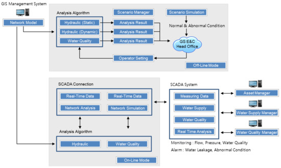 In the first stage of GSWaterS customization, identification numbers for the water supply facilities, including the meters and sensors, were employed based on engineers’ opinions to allow the operators to distinguish between them. The GIS files were used to map the water supply monitoring system so that the operators could use the information on the pipe networks and facilities (e.g., location, length, diameter, equipment specification, etc.). Based on previous studies, a hydraulic model was constructed and compared with actual data in real time through simulations to test the dashboard and alarms for outliers considering various analysis algorithms based on expert opinions and evaluation criteria. Lastly, because it is inefficient to employ too much data for asset management, data were selected based on the functions that the operators required. SCADA provides continuous real-time information and allows the control of thousands of parameters within the water network. However, this massive amount of data does not automatically translate into operational, planning, or service improvements for the water utilities. Rather, the information needs to be interpreted and transformed into actual knowledge that is useful when operating the water supply facilities and making asset management and planning decisions.