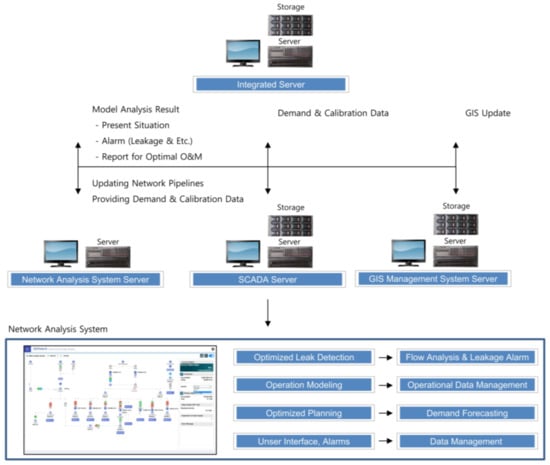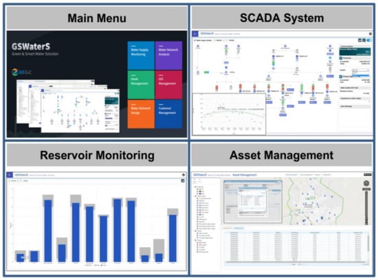 As shown in Figure 2, GSWaterS is a web- and GIS-based water supply O&M platform developed with the support of the Ministry of Environment (Korea) and the Korea Environmental Industry and Technology Institute. It was tested on water supply systems in Korea and Vietnam from 2012 to 2016. GSWaterS comprises six functional modules: (1) water supply monitoring, (2) water network analysis, (3) asset management, (4) GIS management, (5) water network design, and (6) customer management. This solution was customized for the water supply system in Aracatuba, thus the GIS management, water network design, and customer management modules were excluded because the city already had similar systems. The water supply monitoring module was customized to ensure it was fully integrated with the existing SCADA system, which employed real-time monitoring data as input into a water network analysis model and as calibration parameters. This module monitored in detail operating conditions such as the DMA flow rate and pressure, reservoir water level, and pump status. The water network analysis module was customized to incorporate GIS data and included various O&M functions for the water supply system, such as automated event alerts, dynamic modeling that minimized false alarms, historical data analysis, network-based spatial analysis, geolocation of specific events, reports, and managerial dashboards. The asset management module is essential for water utilities to efficiently operate and manage their water supply systems, guiding the acquisition, use, and disposal of assets to optimize their service delivery potential and to manage related risks and costs over their entire lifetime. It employs procedures, tools, principles, and methods that manage life expectancy and the business impact of the costs, performance, and risk associated with infrastructure assets.