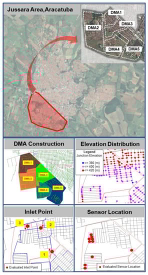 The city of Aracatuba is located in the northwest of Sao Paulo state, Brazil, with a population of 198,129 in 2020 and an area of 1167.4 km2. SAMAR, a GS Inima Brasil subsidiary, provides water and sanitation services for Aracatuba residents. The company has a treatment capacity of 81,600 cubic meters per day, and it manages a water network system of 874 km with 74,200 water connections. Figure 1 presents an overview of the water supply system in Aracatuba. Unlike other mid- and large-sized cities in Brazil, SAMAR has recently made significant efforts to improve the water supply system by adopting O&M technologies and solutions such as SCADA, GIS, and water network design software. However, the city’s water supply has faced various challenges, including relatively high levels of water loss at around 38%. Because there were no flow and pressure monitoring instruments in the water network system before the introduction of the DMAs, it was difficult to effectively manage the water supply system and to significantly reduce water loss by relying on manual water leakage detection only. Therefore, there was a strong need for the city to develop an advanced water supply monitoring and management system to resolve these issues and provide a high-quality water supply that can be fully integrated with existing water solutions.