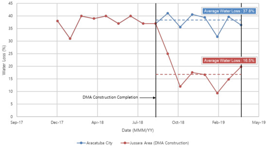 When an abnormal situation occurred in real-time monitoring, an alarm sounded to alert the operator, allowing them to effectively manage water leakage using the appropriate measures. If there was a pump malfunction or abnormal water levels in the reservoir, the operator could immediately contact the site manager to fix the water leakage, the approximate location of which was quickly determined using the sensors installed in the DMA. As a result, in the Jussara region, water leakage was reduced from 38% to 17% (Figure 7 and Table 2).