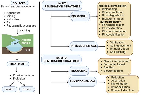 Sources and remediation strategies of water and soil contaminated with heavy metals.