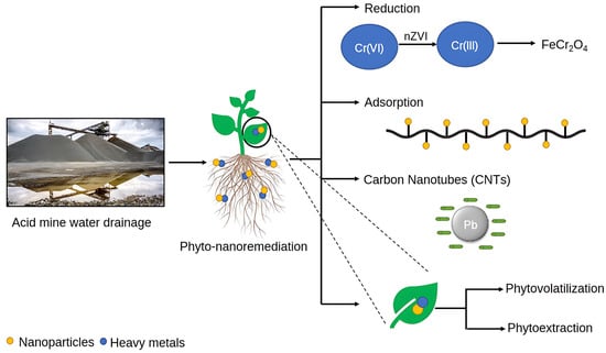 There are numerous processes such as clarification, de-aeration, de-carbonation, sludge densification, or the high-density sludge (HDS) process being extensively employed to treat acid mine drainage water, but most of them are not sustainable and lead to the production of secondary waste in the form of end-products such as methane (CH4) and non-soluble metal oxides or hydroxides, which need to be treated further and hence may not be cost-effective [23]. Acid mine drainage must therefore be properly remedied by integrating novel emerging techniques. Phytoremediation and nanoremediation are two of the most promising techniques for the remediation of acid mine drainage water (Figure 2). The former involves using plants to decontaminate mine drainage water infested with various toxic metals and pollutants. In contrast, the latter reduces the load of pollutants in such water by using NMs with diameters below 100 nm [10]. Both these techniques are effective in revegetating soils contaminated with heavy metals and have gained a high degree of public acceptance as sustainable alternatives to eliminate emerging pollutants such as heavy metals, chlorinated solvents, halogenated chemicals, or pesticides. Furthermore, the synergistic application of these techniques can result in improved heavy metal removal, reducing environmental stress as a result of the application of nanomaterials in low concentrations due to the inculcation of plants as additional remediation agents [24].