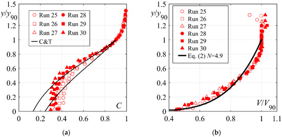 (a) Air concentration profiles at the inflow section for 50° stepped chute tests (Runs 25–30, Table 1), comparison with (―) advective diffusion model [17] with C1 = 0.55 and 0.46, and (b) Dimensionless velocity V/V90 profiles at the inflow section for 50° stepped chute test runs (Runs 25–30, Table 1), comparison with (—) Equation (2).