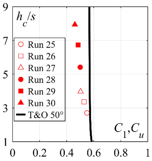 The stepped chutes tests (Runs 10–15 and 25–30, Table 1) included two chute slopes of φ = 30° and 50° systematically investigated for three unit discharges q ≈ 0.20, 0.28 and 0.36 m2/s. They corresponded to skimming flow with 2.7 ≤ hc/s ≤ 7.94. Quasi-uniform approach flow conditions were attained at the 30° stepped chute end with C1 ≈ 0.41 [5]. Detailed analysis of 30° stepped chute approach flows is given in [5]. The air concentration profiles measured at the inflow section for 50° stepped chutes are shown in Figure 4a. The measured range of C1 and the shape of the air concentration profiles for different tests at the inflow section (Figure 4a) suggest that quasi-uniform flow was not fully attained at the stepped chute end for all 50° stepped chutes tests. This is shown in Figure 5, where measured values of C1 are compared to the quasi-uniform mean air concentration values Cu of [18] for the same chute slope and range of relative critical depths. For lower relative critical depths, i.e., hc/s = 2.71 and 3.36 (Runs 25 and 26, Table 1), the flow conditions at the chute end were practically quasi-uniform with C1/Cu ≈ 0.95 (Figure 5). On the other hand, for higher relative critical depths, i.e., for 3.97 ≤ hc/s ≤ 7.94 (Runs 27–30, Table 1), gradually varied flow conditions were attained. The advection diffusion model [17] well described the measured air concentration profiles, excepted close to the pseudo-bottom (Figure 4a). The dimensionless velocity V/V90 profiles at the inflow section (Figure 4b) follow Equation (2) with N = 4.9 (R2 = 0.87). Similarly to the results of other studies on steep chutes (e.g., [18,19]), a lower N was obtained as compared to 30° stepped chutes (N = 5.5 [5]).