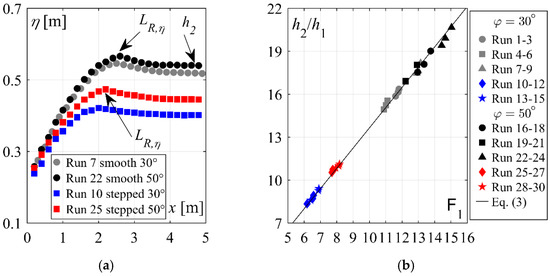 (a) Streamwise mean flow depths η along the stilling basin, and (b) Sequent depth ratio h2/h1 as a function of the approach Froude number F1; (—) Equation (3); [Runs 1–9: 30° smooth chute, Runs 10–15: 30° stepped chute, Runs 16–24: 50° smooth chute, Runs 25–30: 50° stepped chute].