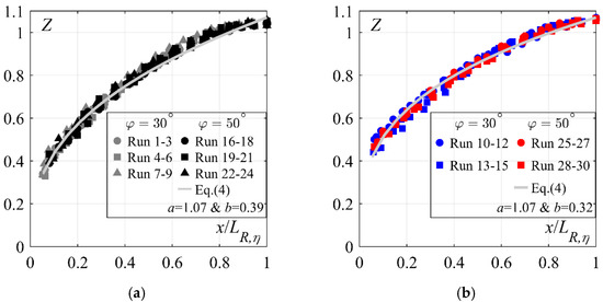 Dimensionless flow depths Z along the jump roller for 30° and 50°: (a) smooth and (b) stepped chute inflows; (—) Equation (4); [Runs 1–9: 30° smooth chute, Runs 10–15: 30° stepped chute, Runs 16–24: 50° smooth chute, Runs 25–30: 50° stepped chute].