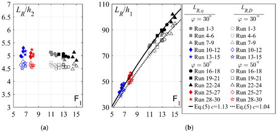 Roller lengths obtained from ultrasonic displacement meter measurement LR,η and visual observation LR,D plotted against F1 as: (a) LR/h2 and (b) LR/h1; (− −) Equation (5); [Runs 1–9: 30° smooth chute, Runs 10–15: 30° stepped chute, Runs 16–24: 50° smooth chute, Runs 25–30: 50° stepped chute].