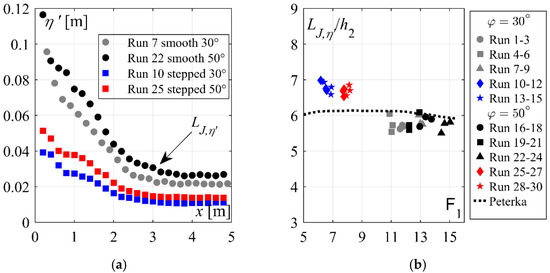 (a) Streamwise flow depth fluctuations η’ along the stilling basin (Table 1) and (b) Dimensionless jump lengths LJ,η’ obtained from flow depth fluctuations η’ as a function of the inflow Froude number F1, compared to jump length prediction of [20]; [Runs 1–9: 30° smooth chute, Runs 10–15: 30° stepped chute, Runs 16–24: 50° smooth chute, Runs 25–30: 50° stepped chute].