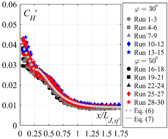 Streamwise development of the flow depth fluctuation coefficient CH’ versus the normalized streamwise coordinate x/LJ,η’ for 30° and 50° smooth and stepped chute tests; (− −) Equation (6), (—) Equation (7); [Runs 1–9: 30° smooth chute, Runs 10–15: 30° stepped chute, Runs 16–24: 50° smooth chute, Runs 25–30: 50° stepped chute].