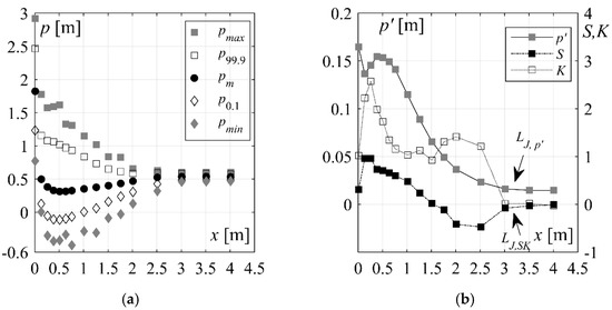 Streamwise pressure distribution (Run 22, smooth chutes, Table 1) of: (a) extreme maximum pmax, 99.9% probability p99.9, mean pm, 0.1% probability p0.1, and extreme minimum pressure pmin, and (b) fluctuating pressure p’, skewness S and excess kurtosis K.