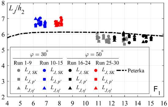 The dimensionless roller lengths LR/h2 for 50° (black symbols) smooth (Runs 16–24) and stepped (Runs 25–30) chute inflows, obtained from flow depth measurements LR,η and visual observations LR,D, are plotted against the F1 in Figure 8a and compared to the dimensionless roller lengths obtained with 30° (gray symbols) smooth (Runs 1–9) and stepped (Runs 10–15) chute inflows. One can notice that the dimensionless roller lengths LR,η/h2 (full symbols) are practically independent of the approach flow conditions or chute slope φ with a typical value of LR,η ≈ 5.0h2. Similarly to the conclusions made in [5], the visually observed roller lengths (open symbols) are consistently shorter, with typical values of LR,η ≈ 4.6h2.