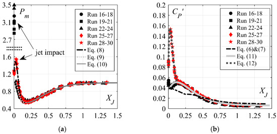 Streamwise distribution of mean pressure coefficients Pm downstream of 30° and 50°: (a) smooth chutes, and (b) stepped chutes; (—) Equation (10); (− −) Equations (8) and (9); [Runs 1–9: 30° smooth chute, Runs 10–15: 30° stepped chute, Runs 16–24: 50° smooth chute, Runs 25–30: 50° stepped chute].