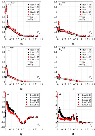 The pressure CP’ and surface fluctuation CH′ are also compared in Figure 13b (only Equations (6) and (7) are included for clarity). As expected, the surface fluctuations were lower than the corresponding pressure fluctuations within the first half of the hydraulic jump, i.e., XJ < 0.5. As for the 30° chute inflows [5], they coincided at XJ ≈ 0.5. At this point, the skewness of the pressure readings reached negative values, indicating a detachment of the bottom jet flow [5] (Figure 13g). The skewness values attended minimal values at XJ ≈ 0.75, beyond which they tended towards zero in the tailwater zone.
