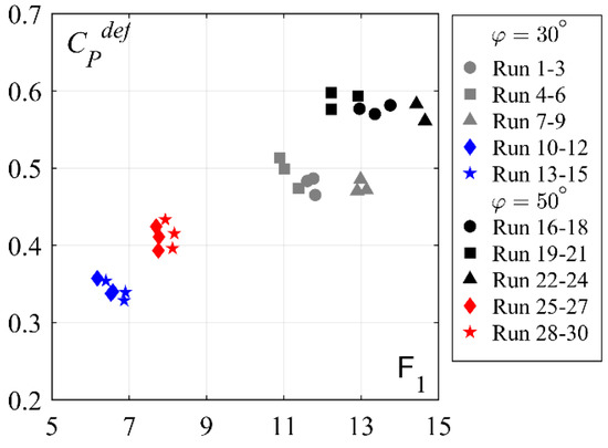 Mean pressure coefficients CPdef against inflow Froude number F1; [Runs 1–9: 30° smooth chute, Runs 10–15: 30° stepped chute, Runs 16–24: 50° smooth chute, Runs 25–30: 50° stepped chute].
