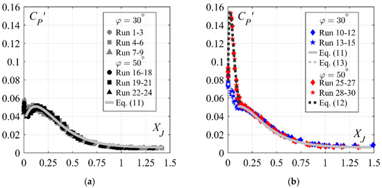 Streamwise development of pressure fluctuation coefficient CP’ for 30° and 50°: (a) smooth chute, and (b) stepped chute; (—) Equation (11); (− −) Equations (12) and (13); [Runs 1–9: 30° smooth chute, Runs 10–15: 30° stepped chute, Runs 16–24: 50° smooth chute, Runs 25–30: 50° stepped chute].