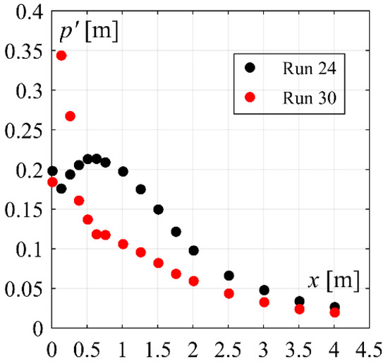 Comparing the pressure fluctuation development (Figure 13b), the effect of stepped chute approach flows becomes evident. At the jump toe, up to 40% higher pressure fluctuation coefficients could be observed, as compared to 50° smooth chute approach flows, reaching up to CP’ = 0.09 (Figure 17). Downstream of the jump toe, the fluctuation magnitudes sharply increased reaching maximum values of CP’ = 0.15 at XJ ≈ 0.04. These values are up to 3 times higher as compared to the maximum values observed for smooth chute approach flows (Figure 13b and Figure 17). To further illustrate the severeness of pressure fluctuations downstream of stepped chute at this location, the absolute values of the pressure fluctuations p′ are compared for smooth (Run 24) and stepped chute (Run 30) inflows in Figure 18 with similar unit discharge of q ≈ 0.360 m2/s. Despite the significantly higher inflow Froude number F1 for the smooth chute inflow (F1 ≈ 14), as compared to stepped chute inflow (F1 ≈ 8), the absolute values of pressure fluctuations p′ downstream of stepped chute were about 50% higher at the flow deflection point, as compared to the maximum values observed with smooth chute approach flow (i.e., in the zone of maximum pressure fluctuations at XJ ≈ 0.12). This shows that pronounced pressure fluctuations downstream of stepped chute are caused by the higher turbulence levels of the approaching flow, as compared to smooth chute approach flows. Downstream of the flow deflection point, i.e., XJ > 0.04, the pressure fluctuation coefficients monotonically decreased up to XJ ≈ 0.13, after which they coincided with smooth chute approach flows magnitudes over the entire stilling basin reach (Figure 13b). No considerable effect of step size s occurred.