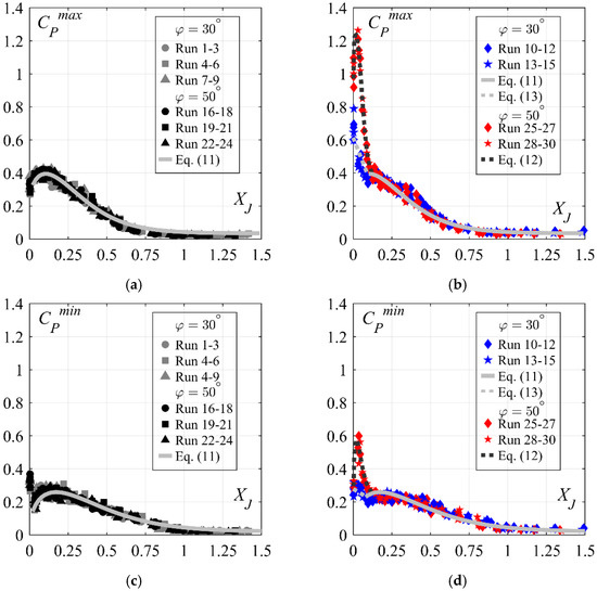 Streamwise development of extreme pressure coefficients: (a) CPmax for 30° and 50° smooth chutes, (b) CPmax for 30° and 50° stepped chutes, (c) CPmin for 30° and 50° smooth chutes, and (d) CPmin for 30° and 50° stepped chutes; (—) Equation (11); (− −) Equations (12) and (13); [Runs 1–9: 30° smooth chute, Runs 10–15: 30° stepped chute, Runs 16–24: 50° smooth chute, Runs 25–30: 50° stepped chute].