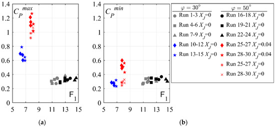 Extreme pressure coefficients: (a) CPmax and (b) CPmin at the flow deflection point and jump toe; [Runs 1–9: 30° smooth chute, Runs 10–15: 30° stepped chute, Runs 16–24: 50° smooth chute, Runs 25–30: 50° stepped chute].