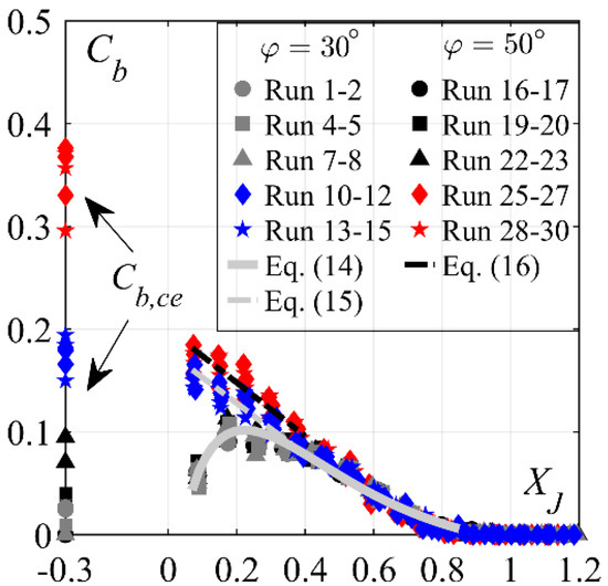 The 50° stepped chute approach flows had significantly higher bottom air concentrations within XJ ≤ 0.4, as compared to 50° smooth chute approach flows, with values reaching up to Cb = 0.18 at XJ = 0.08 (Figure 21). The increased values after 50° stepped chute approach flows, similarly to those after 30° stepped chutes, can be attributed to the significantly higher Cb,ce and comparatively lower pressure magnitudes at the flow deviation point [12] (Figure 13a). Further downstream, the values of Cb decreased up to XJ ≈ 0.4, beyond which they coincide with smooth chute approach flow values. Comparing the 30° and 50° stepped chute approach flows (Figure 21), it was noticeable that 50° stepped chute had a slightly higher air concentration (on average 2% more) within XJ ≤ 0.4, as compared to 30° stepped chute, despite the significantly higher bottom air concentration at the 50° stepped chute end (18%, on average) This was caused by the higher pressure magnitudes at the flow deviation point downstream of 50° stepped chute (Figure 13a), which lead to higher de-aeration rates at the basin entrance. Further downstream, i.e., XJ > 0.4, the bottom air concentration development was independent of the chute slope φ