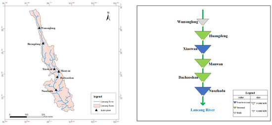The models and solution techniques presented in this work were applied to the cascaded hydropower plants on the Lancang River, located in southwest China. The total water head drop of the main stream of the Upper Mekong River reaches 5500 m, of which 91% concentrates in the Lancang River, and impressively, 90% of the total drop is concentrated above the Nuozhadu Hydropower Plant. The exploitable hydropower resources of the Lancang River amount to about 30 million kilowatts. Up to now, 11 hydropower plants have been put into operation in the Lancang River. Figure 2 shows the hydraulic layout of the six reservoirs studied in this work, which are all located on the Lancang River in Yunnan Province, China, where the flood seasons are usually from July to September, with the dry seasons in the other months.