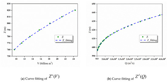 Figure 2 shows the exponential functions fitted to the curves of the Nuozhadu Reservoir, which has the largest installed capacity in the Lancang River. As described in Table 3 and Table 4, the function of the fitting curve in Figure 3a,b were and , respectively. Obviously, the fitting accuracy of the two functions was extremely high, with almost every point on the curve where the function was located.