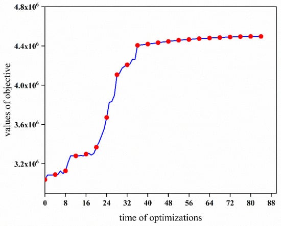 Figure 4 shows that the objective functional value monotonically increased until reaching its convergence criterion after about 86 iterations. In the early stage of optimization, the improvement of the objective value was more obvious, while in the later stage, the improvement speed decreased significantly. It was observed that the spillages were the first decision variables that were optimized in the line search of the golden section method, with a very fast evolution, leading to substantial improvements on the objective in the early stage. When the spillage approached its optimum, the algorithm turned its optimization to the storage, generating discharge and outflow, which are closely coupled with each other, with a small space to explore in the line search, resulting in a slow convergence in the later stage. The increasing monotonicity is a very good property, which ensures the convergence of the method.