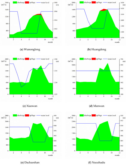 Figure 6 illustrates the results of the optimal scheduling process of the six cascaded hydropower reservoirs. Without help from large reservoirs upstream, the Wunonglong and Huangdeng hydropower reservoirs, with limited refilling capability themselves, had a small amount of spillage scheduled during the flood seasons. The change in water levels at all hydropower plants followed the same trajectory, that is, drawing down during the dry seasons and then rising during the flood seasons to have as little spillage occurring as possible and to generate hydroelectricity as much as possible. The reservoirs had some of their storage capacity set aside during flood seasons to meet the need of flood control. At Manwan, however, its water level remained unchanged throughout the year because it had no duty in flood control and its flood limit water level was equal to the normal water level. No spillage also occurred at Manwan thanks to its upstream reservoir, Xiaowan, which has an over-year operability.