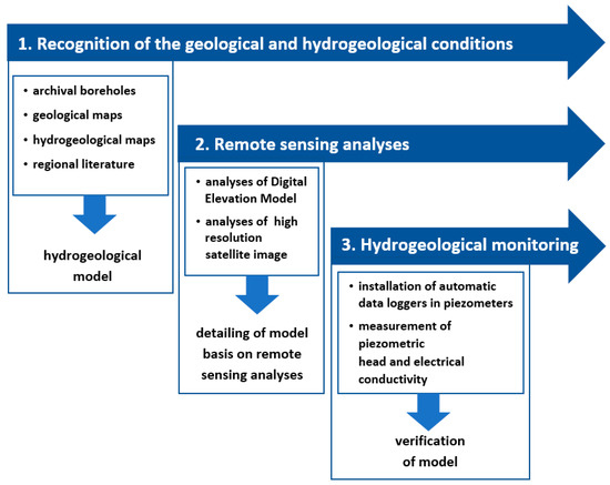 The research was conducted in three stages: stage 1 and stage 2 are described in the previous article [19] concerned with hydrogeological exploration based on archival materials, hydrogeological drilling, remote-sensing methods and mathematical modeling of groundwater flow. They are summarized in this capture below.