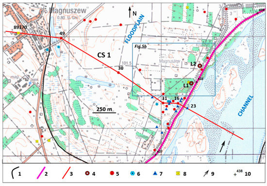 Figure 3. Line of the geological cross-section located in Figure 4. 1—border line of the area, 2—embankments, 3—line of cross-section, 4—data loggers, 5— drillings, 6—water gauge, 7—shallow piezometers. 8—archive drillings, 9—Vistula flow direction, 10—kilometer of the river.