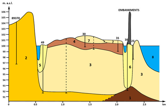 Figure 4. Schematic geological cross-section. 1—sub-alluvia bedrock protrusion (loam); 2—Pleistocene upper terrace (sand); 3—Holocene alluvia (sand and gravel); 4—Holocene alluvia (loams and clays); 5—oxbow lake partially filled with flood deposits (sand); 6—crevasse channel (sand); 7—contemporary alluvia; 8—Vistula channel. - (2)
