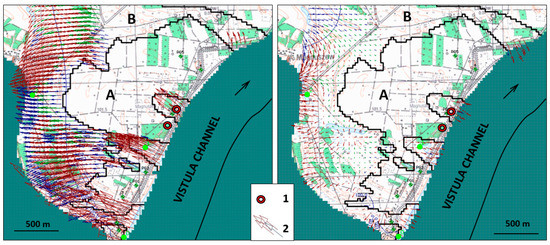 Groundwater flow under conditions of high (left) and low (right) water level; south part of studied area; plots from the MODFLOW model; A—outcrops of loamy flood deposits; B—transformed surface as well as filled crevasses; 1—piezometer; acc. [19] 2—flow vector.