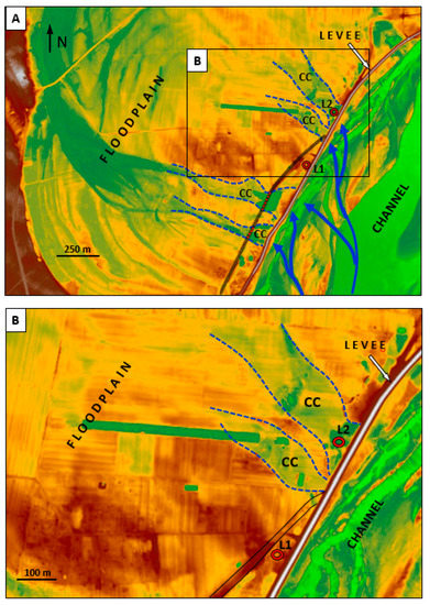- The second series consists of meandering river alluvia deposited in the Holocene up to 300 years BP [12]. Due to the considerable decrease in the dynamics of channel processes, resulting, e.g., from the development of dense plant cover on the basin area, that limit surface runoff [14], fine-grained material was deposited during the surges on the floodplain area [37]. This resulted in the considerable thickness of surge sediments formed as loams and silty loams; their thickness reaches 7 m in the studied area [18] (Figure 3 and Figure 4).
