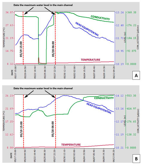 The results of the measurements of head equipotential temperature and electrolytic conductivity in the piezometer located in the crevasse channel (A) and in an untransformed terrace (B). The red line marks the maximum water level between the embankments (peak of the surge).