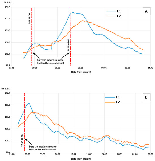 Head equipotential in measuring points during the surge in 2019 (A) and 2020 (B). The red line marks the maximum water level between the embankments (peak of the surge).