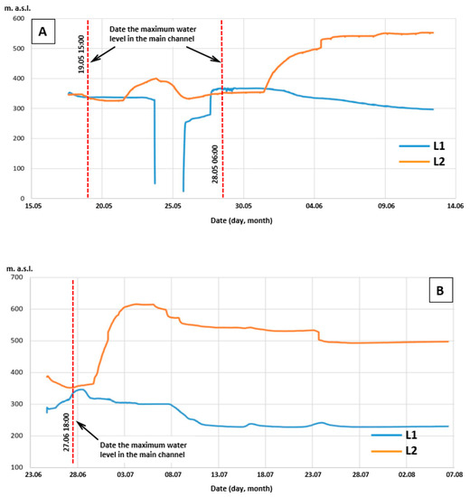 Remote-sensing studies resulted in identifying the location of a crevasse channel which was created still before the construction of the flood embankment. In order to examine the lithological profile and confirm the existence of anomalies in the geological structure (erosion gutter filed with soil well conductive to groundwater), two boreholes of 6 m depth below ground level were drilled within this form and in its vicinity. The boreholes were made with a hand drill set. Piezometers made of PVC tubes with a diameter of 50 mm were installed in the boreholes. The screen was installed at a depth of 3.5–4.0 m below ground level. Electronic data recorders (Solinst LTC M 10 model 3001 Georgetown, ON, Canada) of water head level (equipotential), electrolytic conductivity and temperature were installed in the piezometers (Figure 6). Two loggers were installed in the zone where the most visual erosional channel is visible in the remote-sensing image (L2-Figure 6), and in the place where the area has not been transformed (L1-Figure 6).