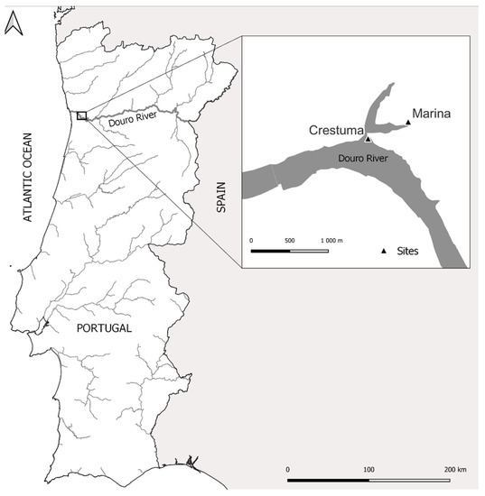 Map location of the study area with the sampling sites positions in the Douro River: the Crestuma-Lever reservoir: Crestuma (41°04′38.2″ N, 8°28′20″ W) and Marina (41°04′45″ N, 8°27′58″ W).
