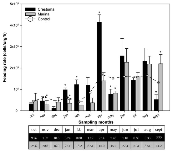 The results of the D. magna feeding rate assays with water samples from Crestuma and Marina are shown in Figure 2 and Table 3. Overall, in the aquatic ecosystems, Daphnia shows seasonality, reaching a high-density peak during early spring and late winter. This density increase occurs due to the high light intensity, which combined with the availability of nutrients, allows the growth of phytoplankton and, consequently, of herbivory (by part of the zooplanktonic species), as shown by Castro and Gonçalves [33]. This link between the abiotic parameters and biological response could corroborate our results regarding feeding behavior.