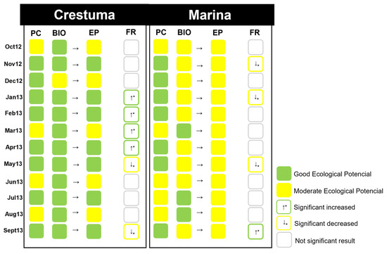Physical and chemical (PC), biological (BIO) elements, and final ecological potential (FP from Table 1 and Table 2) classification for Crestuma and Marina water samples, from each sampling period. Daphnia magna feeding rate (FR from Figure 2) results were also presented as additional water evaluation data. Green—Good Ecological Potential (GEP); Yellow—Moderate Ecological Potential (MEP). FR color evaluations were performed according to the classes of disturbances described in Rodrigues et al., [34].