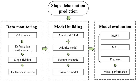 - Model building is the second step in slope deformation prediction. In our research, long short-term memory (LSTM) was adopted in deformation prediction. The attention mechanism was also considered in the LSTM establishment. Then, the additive model was used to build training features. Both the original and generated features were fed to the LSTM model. According to the idea of the model ensemble, the final prediction model was established.