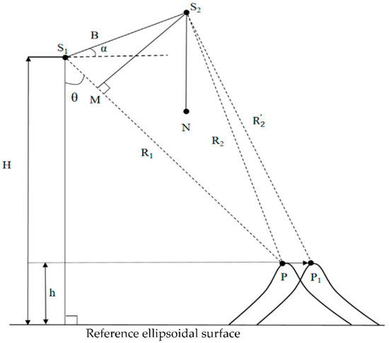 InSAR uses radar technology to acquire two or more SAR images from various observation angles of the same ground area and performs interferometric measurements on the research area. The InSAR technology mainly establishes the correspondence function relationship between phase and surface elevation and surface deformation through phase analysis. The relationship is then used to solve the specific ground elevation and surface shape variables. Figure 2 illustrates the InSAR technical geometry.
