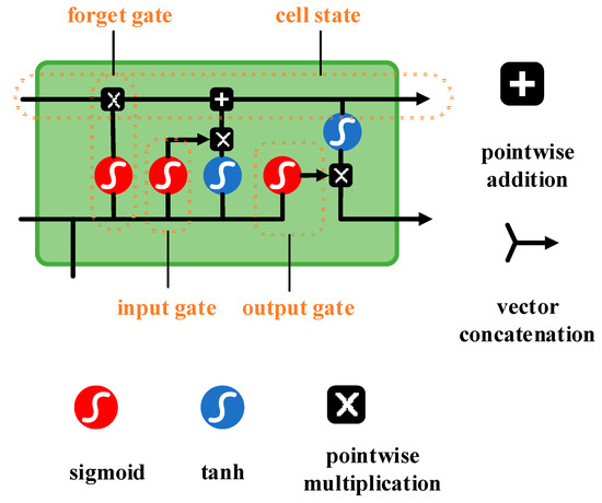 The LSTM is an RNN model with feedback connections. RNN achieves significant performance in time series sequence processing. However, RNN struggles to use information from previous steps in later steps because of its short-term memory. Additionally, the gradient vanishing problem exists in the RNN model; the gradient is a value used to update the weight of the neural network. The gradient vanishing problem occurs when the gradient shrinks as it propagates backward over time. If the gradient becomes extremely small, it contributes little to learning; therefore, the LSTM was proposed. Cells in the LSTM network control learning for a long period. An LSTM cell includes the input gate, output gate, and forget gate, as illustrated in Figure 3. The information transmission is controlled by the three gates in the LSTM block, and the three gates determine the data to keep or discard. The relevant information in the long chain of data sequences can be learned using the gates.