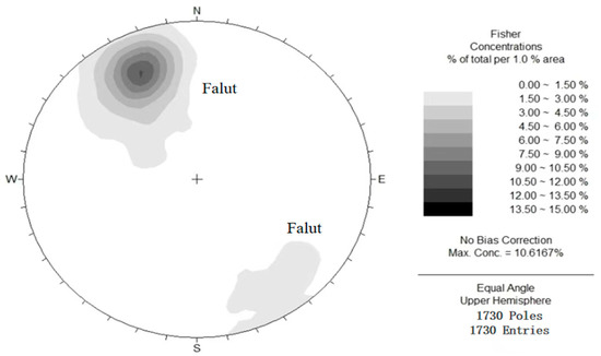 It can be observed from Figure 5 that the compression faults between the rock strata are the most developed, constituting two-thirds of all the faults. The occurrence of these faults is similar to that of the responding rock strata. Shear faults are the second most developed but have a scattered distribution, making it difficult to find them on the iso-density map. In the geological survey, the faults and fractures in the sandstone stratum (T2-Ss) are less than those in another stratum. In the rock stratum of slate, the number of faults increases, especially in the interlaminated sand slate rock strata. The faults develop along the boundary of the sand and slate. Meanwhile, more faults and fractures exist in a large scale in the landslide slope, which is caused by the shear movement of dipped rock.