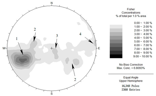 It can also be observed that the shallow faults between the rock strata are only less developed than the compression faults, which constitute one-third of all the faults. The shallow faults are of a large scale and have a long extension distance. All faults belong to four dominant groups. The groups were 1, 2, 3, and 4 in order of their dominant development, as shown in Figure 6.